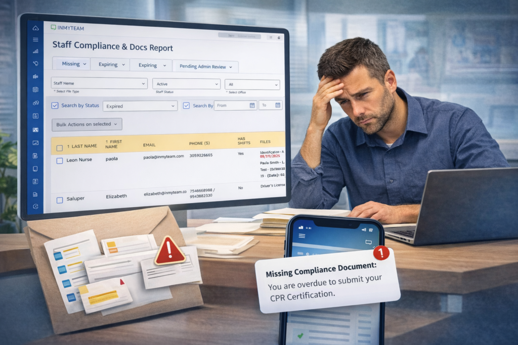 For example, tools like INMYTEAM Home Care Software provide a staff compliance and documents report that organizes everything in one place—showing: